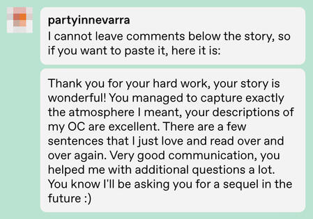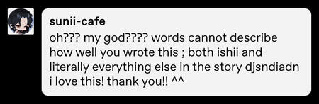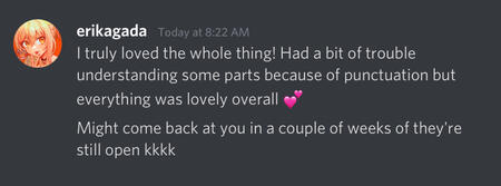 PROCESS1. DM me (Tumblr or Discord)2. Slot confirmation3. Fill out the form4. Wait for invoice for First Payment before paying (50% Estimated Payment to begin the Draft)5. Wait for update for 3-14 Days and for Second Payment6. Full Payment for release of work7. (Your) Checking of Grammatical Errors, Wrong characterization or interpretation8. If there are, rewrite is expected to be 1-3 Days before point 7 will be repeated